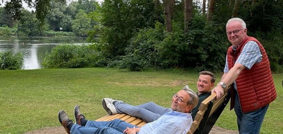 Bürgermeister Peter Horstmann zeigte sich im Austausch mit Hubert Schulze Althoff und Klaus Ende beeindruckt von der idyllischen Standortwahl für die Liegebänke, die dazu einladen, die Schönheit des Emsseeparks auf besondere Art und Weise zu genießen.