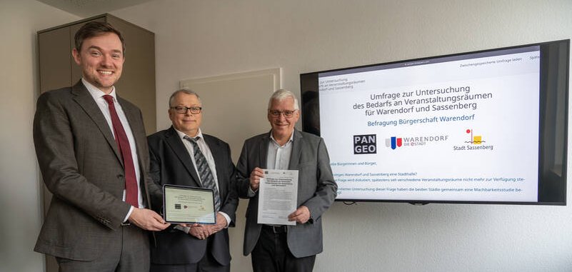 Den Auftrag für die Untersuchung hat das Planungsbüro PAN GEO Gesellschaft für Angewandte Geographie mbH aus Stuttgart erhalten. PAN GEO kann insbesondere im Bereich der Planung von Veranstaltungsimmobilien auf langjährige Erfahrung zugrückgreifen. Geschäftsführer Dr. Johannes Feifel konnte sich bereits in dieser Woche in Warendorf und Sassenberg mit den örtlichen Gegebenheiten vertraut machen. Im Austausch mit den Bürgermeistern Josef Uphoff (Sassenberg) und Peter Horstmann (Warendorf) wurde als nächster Schritt eine Befragung der Bürgerschaft beider Städte zu ihrem Veranstaltungsbedarf vereinbart.