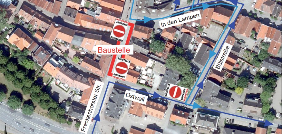 Um die Erreichbarkeit der umliegenden Straßenzüge weiterhin zu gewährleisten, wird der vom Freckenhorster Tor in die Altstadt hineinfahrende Verkehr über den Ostwall in Richtung Osttor umgeleitet. Dazu wird der gesamte Ostwall als Einbahnstraße eingerichtet. Der motorisierte Verkehr kann die Altstadt in diesem Zeitraum daher nicht über das Freckenhorster Tor verlassen. Zusätzlich wird die Einbahnstraßenregelung der Straße In den Lampen aufgehoben, so dass die anliegenden Parkplätze (Arztpraxis und Rossmann) über die Bülstraße angefahren werden können.