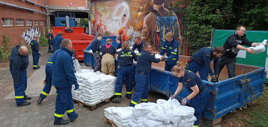 Ein Teil der gefüllten Sandsäcke verbleibt in Warendorf für mögliche Einsätze hier vor Ort, trockene, leere Sandsäcke sind außerdem eingelagert, die im Bedarfsfall sofort gefüllt werden können.