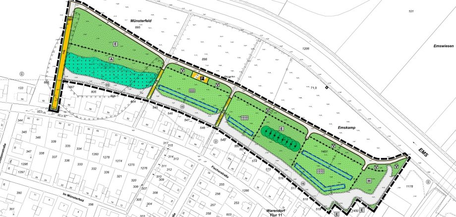Im Zuge der Umsetzung der Wasserrahmenrichtlinie (WRRL) in Warendorf „Neue Ems“ im innerstädtischen Bereich (Abschnitt 2 „Ems-West“) wird der Flussverlauf der heutigen Ems umgestaltet. Dabei werden Teile des bis 2024 bestandenen, aber nicht planungsrechtlich abgesicherten, Grabelandes an der Fischerstraße für die Herstellung der Sekundäraue, der Randsenke und der Wegeverlegung des Emsradweges im Norden sowie der linearen Geländemodellierung im Süden des Plangebietes in Anspruch genommen. Östlich an das bisherige Grabeland angrenzend konnten seitens der Stadt Warendorf zusätzliche Flächen erworben werden, sodass die Möglichkeit besteht, die Flächen neu zu ordnen und dauerhaft einer gesicherten Nutzung als Kleingartenanlage zuzuführen.