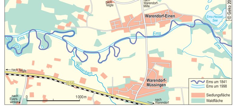 Das sehr geringe Gefälle der Ems und ihr sandiges, sehr leicht erodierbares Flussbett haben dazu geführt, dass sich der Flusslauf im Laufe der Zeit immer wieder änderte – vor allem nach Hochwasserereignissen. Die Flussaue wies daher ein äußerst abwechslungsreiches Relief auf, erschwerte jedoch auch den ansässigen Landwirten eine Bestellung der Felder.