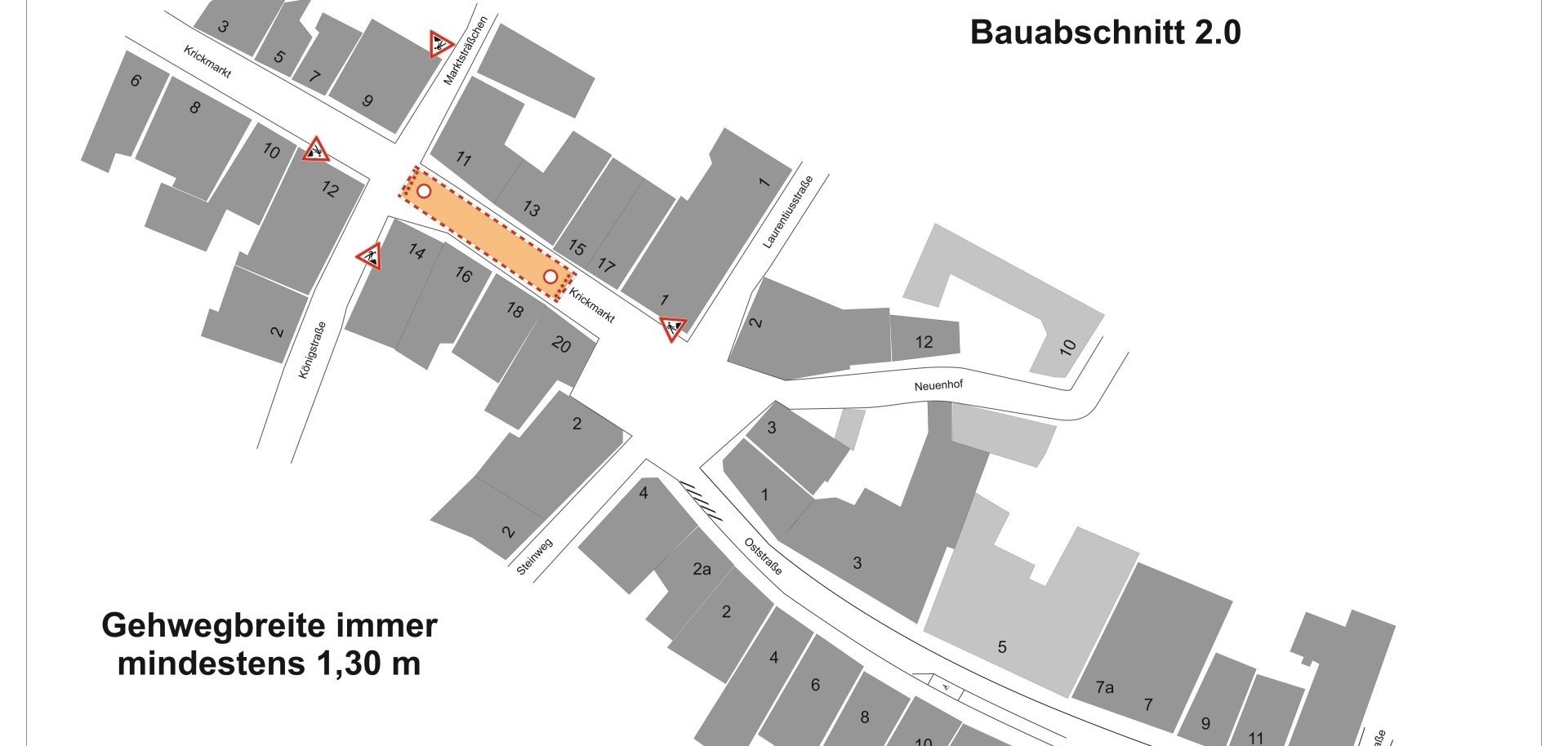 Im Oktober 2025 startete am Heumarkt/Krickmarkt zudem die dritte und damit finale Bauphase: die Wiederherstellungsarbeiten zur Neugestaltung und Aufwertung der Warendorfer Fußgängerzone. Der barrierearme Ausbau, die moderne Gestaltung und die erneuerten Oberflächen werden die Aufenthaltsqualität spürbar verbessern.