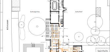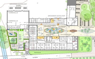 Der Neubau wird an der Position der zurückgebauten Gebäude der OGS und Verwaltung errichtet. Der Neubau sieht eine U-förmige Bebauung mit einem neuem Verwaltungstrakt und einem eingeschossigem Ganztagsbereich vor, die die vorhandene Gebäudestruktur weiterführt. Durch die Fortführung des vorhandenen Schleppdachs und die städtebauliche Setzung der neuen Baukörper entstehen in den Freibereichen ein kleiner Schulhof und ein Schulgarten mit Gartenlabor.