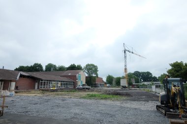 Denkmal Dechant-Wessing Schule am 18.06.2024Der Bestandsbau im Süden des Schulkomplexes wird aufgestockt, der Verbindungsbau zum denkmalgeschützten Altbau zurück gebaut und durch einen offenen Mensabereich erneuert. Auch der denkmalgeschützte Altbau selbst soll saniert werden und künftig neuen Raum für die Verwaltung und die OGS der Schulte bieten. Um Raum für die Sanierungen und Umbauten zu schaffen, werden für den Zeitraum der Baumaßnahme Ausweichmöglichkeiten für die Schule im Bereich zwischen Turnhalle und "Wieninger Bach" geschaffen.