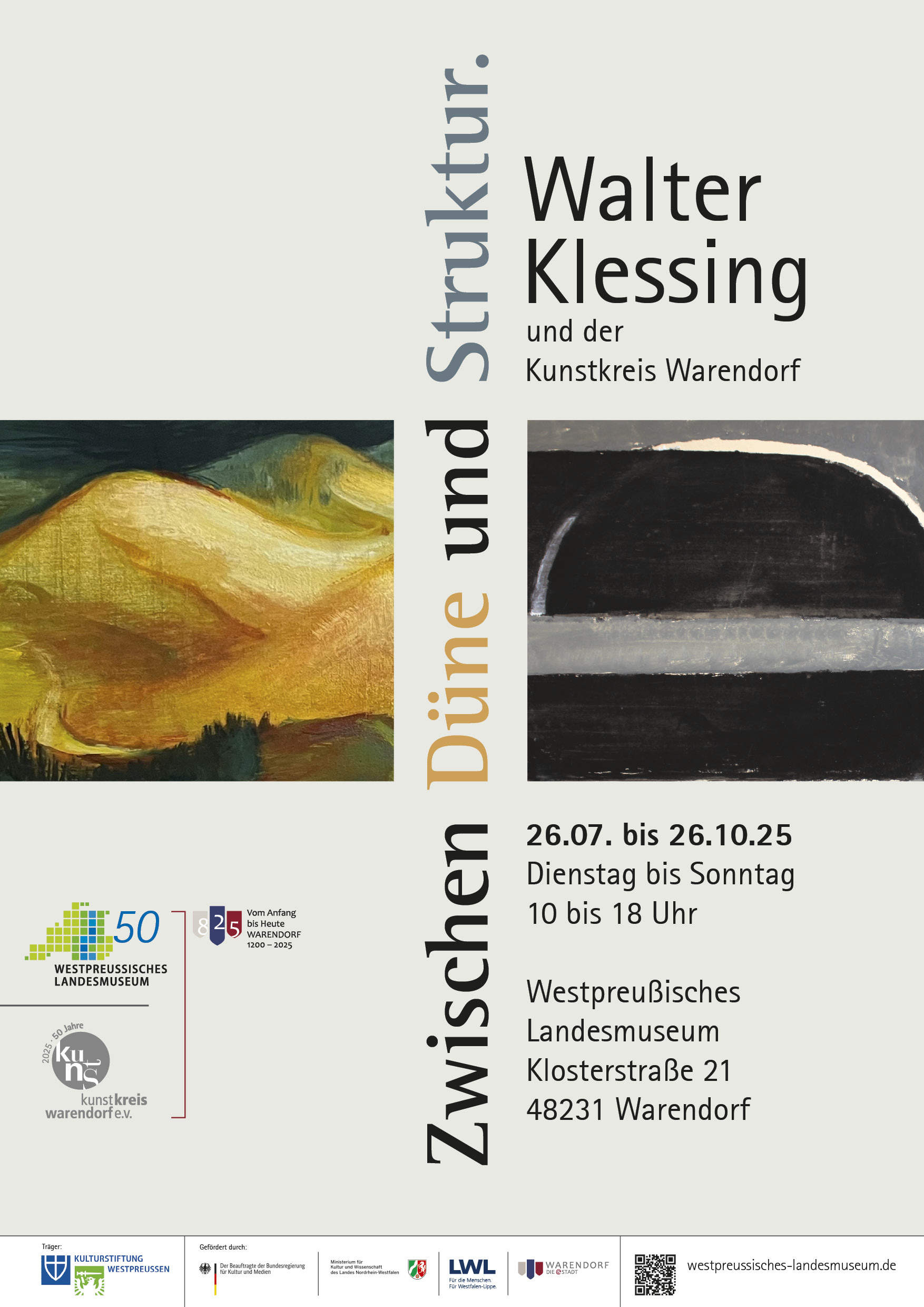 Die Ausstellung des Westpreußischen Landesmuseums widmet sich dem künstlerischen Œuvre von Walter Klessing (1913–1990), einem Maler, Grafiker und engagierten Kunsterzieher, dessen Werk die Spannungsfelder zwischen naturalistischer Landschaftsdarstellung und abstrakter Formensprache erkundet. Geboren in Danzig und nach dem Zweiten Weltkrieg in Warendorf ansässig, erzählt Klessings Schaffen eine biografische und künstlerische Reise – beginnend mit den ersten Ostseelandschaften der 1930er Jahre bis hin zu den strukturellen und formalen Experimenten der 1960er und 70er Jahre, inspiriert von den avantgardistischen Strömungen seiner Zeit. 1975 gehörte er zu den Gründern des Kunstkreises Warendorf, dessen Ziel es war, alle anerkannten Künstlerinnen und Künstler der Stadt zu gewinnen und durch Ausstellungen einem breiten Publikum vorzustellen. Eine begleitende Kabinettausstellung unter dem Titel „GESTERN“ anlässlich seines 50-jährigen Jubiläums präsentiert eine Auswahl früher Arbeiten der künstlerisch tätigen Gründungsmitglieder des Kunstkreises Warendorf.