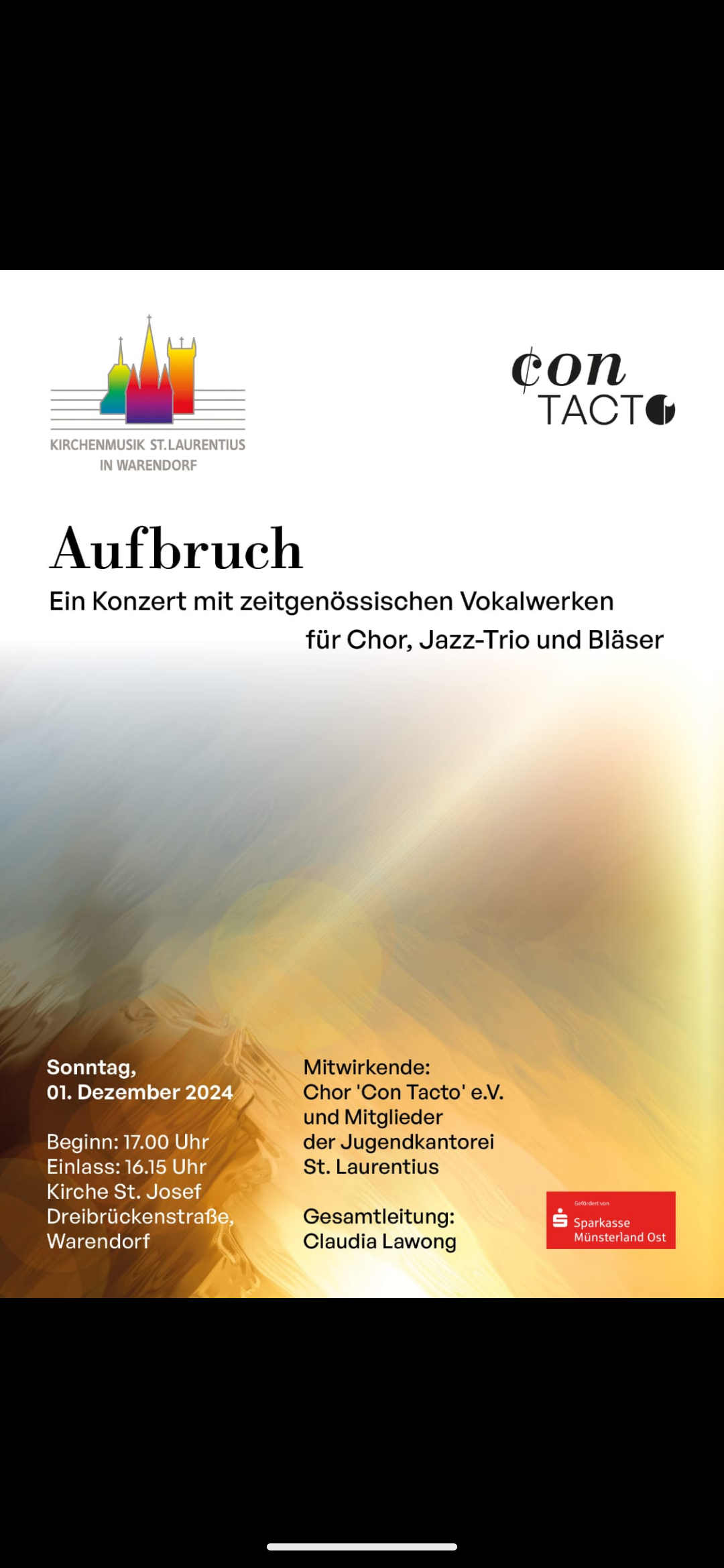 Der Chor 'Con Tacto' e. V. wird zusammen mit einem Jazzensemble, Bläsern und der Jugendkantorei St. Laurentius Warendorf ein Konzert mit modernen Chorwerken zum Thema "Aufbruch" gestalten.