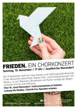 Der 9. November steht für viele düstere und hoffnungsvolle Momentein der deutschen Geschichte. Dieses Chor-und Orchesterkonzert mit Musik u.a. von Telemann, Buxtehude und Rutter schlägt den Bogen zwischen Furcht und Hoffnung.