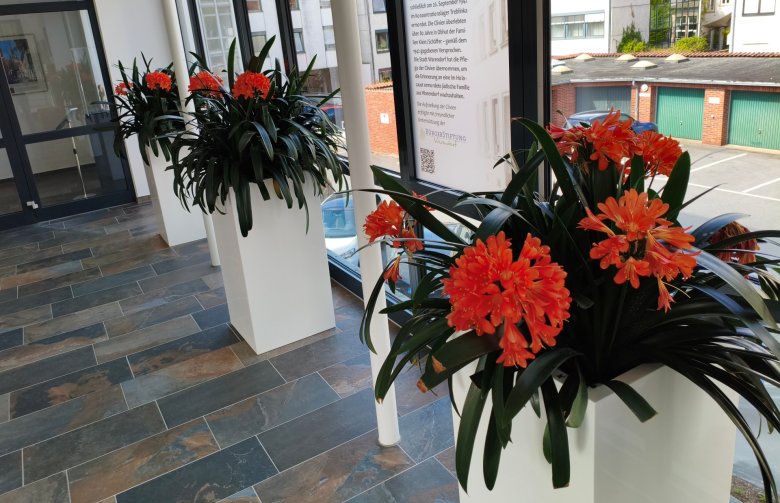 „ Wir sind ja bald wieder da …“ – mit diesen Worten bat Rieka Elsberg ihre Nachbarin Agnes Klein darum, sich um ihre Clivien zu kümmern – ein ganz alltäglicher Vorgang, wie er auch heute noch unter Nachbarn üblich ist. Die Pflanzen standen im Haus Oststraße 7 auf Säulen im Treppenhaus und begrüßten hier die Gäste. Bis zum 31. Juli 1942 erlebten die Pflanzen schicksalhafte Abschiede und freudige Begrüßungen. An diesem Tag wurden Rieka Elsberg und ihr Mann, der jüdische Viehhändler Wilhelm Elsberg von Münster aus in das KZ Theresienstadt deportiert, acht Wochen später sollten sie im KZ Treblinka ermordet werden. Die drei Clivien zählen zu den wenigen Hinterlassenschaften, die in Warendorf heute noch an die Familie Elsberg erinnern.