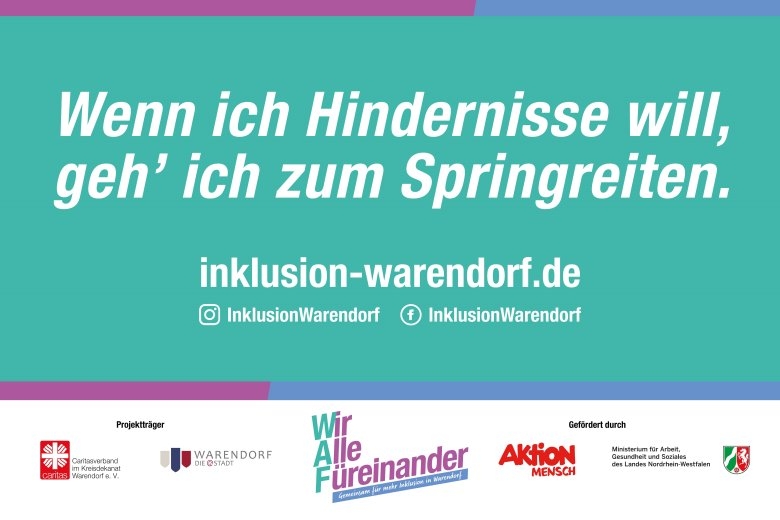 Im Rahmen von „Inklusion vor Ort“ starten die Stadt Warendorf und der Kreiscaritasverband eine stadtweite Plakatkampagne, um das Bewusstsein für Inklusion zu stärken. Unter dem Motto „Wir Alle Füreinander“ werden in der gesamten Stadt zunächst an acht zentralen Orten und Einrichtungen Banner mit einprägsamen Sprüchen wie „Wenn ich Hindernisse will, geh ich zum Springreiten“ zu sehen sein.