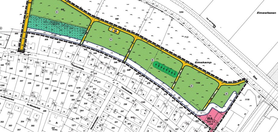 Im Zuge der Umsetzung der Wasserrahmenrichtlinie (WRRL) wird der Flussverlauf der heutigen Ems im innerstädtischen Bereich von Warendorf durch das Projekt „Neue Ems“ umgestaltet. Dabei werden Teile des bestehenden jedoch derzeit planungsrechtlich nicht abgesicherten Grabelandes an der Fischerstraße für die Herstellung der Sekundäraue, der Randsenke und der Wegeverlegung des Emsradweges sowie der linearen Geländemodellierung in Anspruch genommen. Um die daraus entstehenden Restflächen als Grabelandflächen ausweisen zu können und diese planungsrechtlich abzusichern, sollen nördlich der Bebauung an der Fischerstraße Grünflächen mit der Zweckbestimmung „Grabeland“ entstehen.