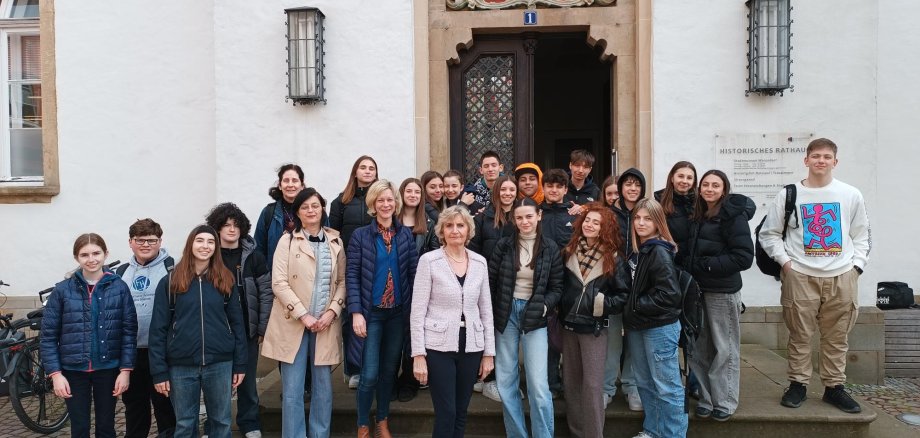 Eine Gruppe von Schüler*innen aus der italienischen Stadt Pesaro ist am Morgen von der stellvertretenden Bürgermeisterin Doris Kaiser im historischen Rathaus der Stadt Warendorf empfangen worden. 18 italienische Schülerinnen und Schüler im Alter zwischen 15 und 17 Jahren sind in Begleitung zweier Deutschlehrerinnen für eine Woche in Warendorf. Der Schüleraustausch wird organisiert gemeinsam mit dem Mariengymnasium (MGW).