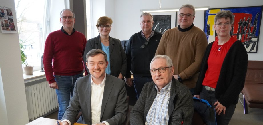 Christoph Schmitz (Amtsleiter Hochbauamt), Maria Kunstleve (Amt Schule Jugend Sport), Jörg Middendorf, Heinz-Peter Zwicker, Andrea Uhkötter (Haus der Vereine) (h.v.l.) Bürgermeister Peter Horstmann, Andreas Uhkötter (v.v.l.)