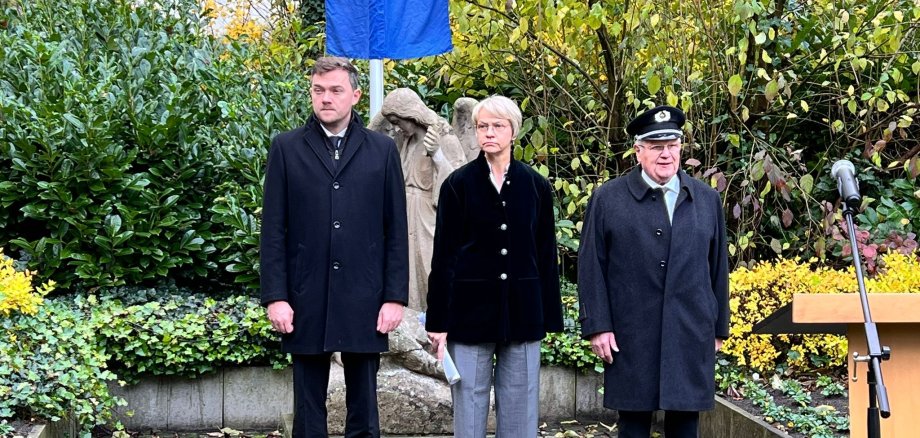 Auf der Veranstaltung in Milte war Dorothee Feller, stellv. Landesvorsitzende des Volksbundes Deutsche Kriegsgräberfürsorge und Ministerin für Schule und Bildung des Landes Nordrhein-Westfalen, und erinnerte an die Opfer von Krieg, Terror und Gewaltherrschaft. „Schülerinnen und Schüler sollten im Laufe ihrer Schulzeit mindestens einmal die Möglichkeit erhalten, eine Gedenkstätte zu besuchen – vor Ort oder auch digital“, machte Ministerin Feller deutlich. Zu den Klängen des Liedes „Ich hatt' einen Kameraden“, gespielt von der Stadtkapelle Warendorf, legte die Ministerin gemeinsam mit Warendorfs Bürgermeister Peter Horstmann einen Kranz am Mahnmal nieder.