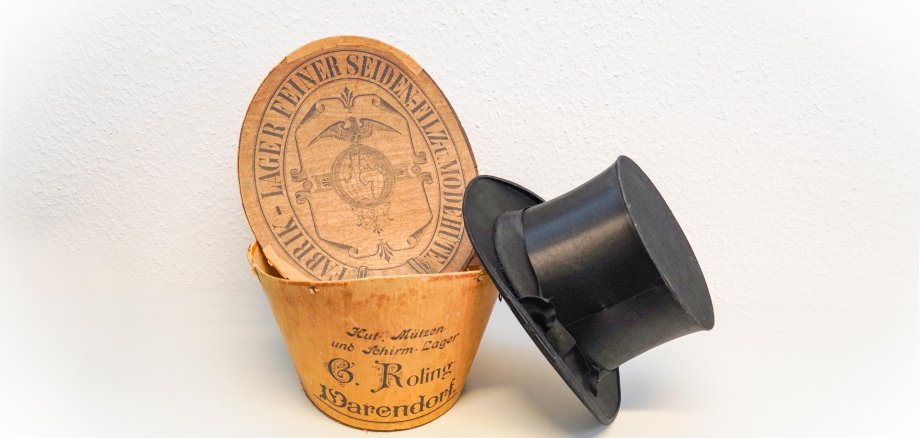 Die Hutschachtel und der Zylinder sind Zeugnisse einer Zeit, in der Hüte ein fester Bestandteil der Herrenmode waren. Die Hutschachtel, gefertigt aus beklebter Pappe, hat die Maße 34 cm x 29 cm x 22 cm (L x B x H) und stammt aus der Zeit um 1900.