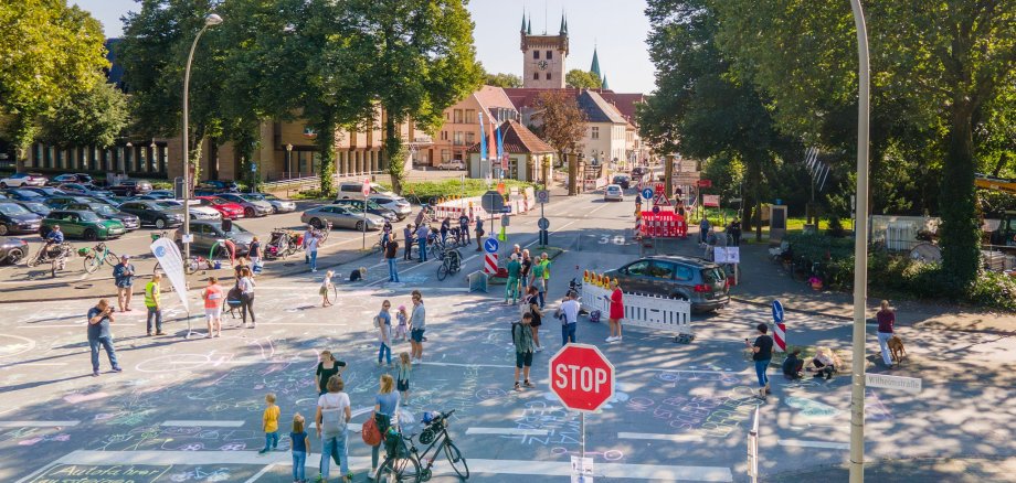 Im Einzelnen soll das Thema „Straßenraum neu verteilen“ auf die notwendige Neuverteilung des Straßenraums zu Gunsten von Fuß- und Radverkehr sowie dem öffentlichen Verkehr, aber auch der Neuverteilung zu Gunsten der Aufenthalts- und Begegnungsmöglichkeiten aufmerksam machen. In Warendorf wird der Parkplatz deshalb kurzzeitig zum Spielplatz und Aufenthaltsraum für Fußgängerinnen und Fußgänger.