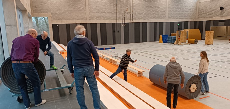 Das Einräumen der Halle mit Sportgeräten aus der alten Halle erfolgt in diesen Tagen durch Mitarbeiterinnen des Team Sport bei der Stadtverwaltung und wird aktiv von Vertretern des TuS Freckenhorst, den Schulhausmeistern und Mitarbeitern vom Baubetriebshof unterstützt.