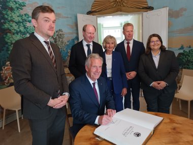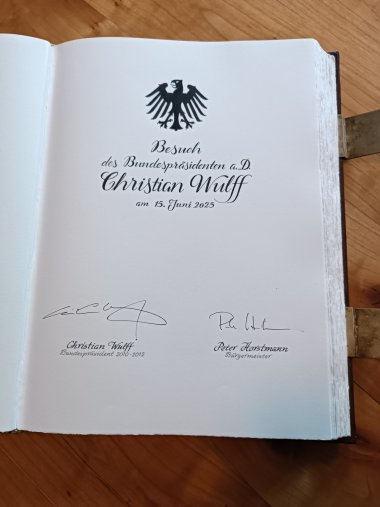 „Es ist uns eine große Ehre, dass Sie sich in das Goldene Buch unserer Stadt eintragen“, so Peter Horstmann und erinnerte an die Integrationsleistungen, die Christian Wulff immer besonders wichtig waren. Der Bundespräsident a.D. zeigte sich dabei begeistert von der Schönheit des Tapetensaals im klassizistischen Bürgerhaus an der Klosterstraße.
