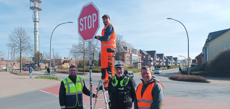 Zusätzlich werden an dieser Kreuzung Stoppschilder für den Autoverkehr aus beiden Richtungen der Bahnhofstraße errichtet und Haltebalken aufgetragen.