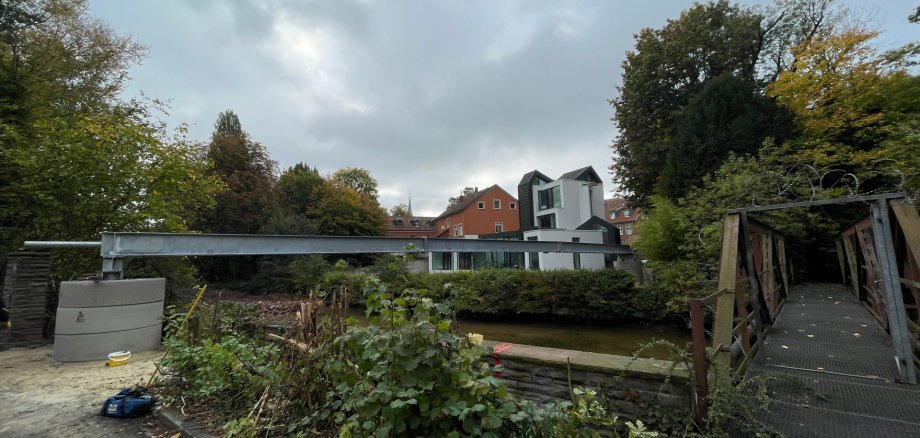 An der Quabbe in Warendorf wurde am heutigen Freitag mit Hilfe eines Krans eine Rohrbrücke über die Ems eingehoben. Die Brücke bildet die Grundlage für die Verlegung wichtiger Versorgungsleitungen und ist damit ein zentraler Baustein in der weiteren Erschließung der Emsinsel.