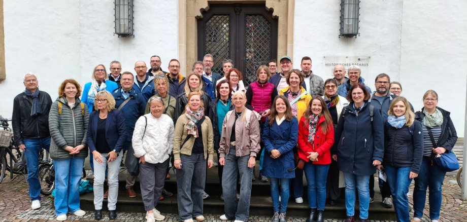 Die Teilnehmerinnen und Teilnehmer einer gemeinsamen Exkursion der Arbeitsgemeinschaft Städte mit historischen Stadtkernen des Landes Brandenburg sowie der Arbeitsgemeinschaft Historische Stadt- und Ortskerne in Nordrhein-Westfalen sind heute in Warendorf gewesen. Gemeinsam mit den Städten Lemgo und Rheda-Wiedenbrück gaben Vertreter der Stadt Warendorf dabei Einblicke in aktuelle Projekte der Stadtentwicklung und Denkmalpflege.