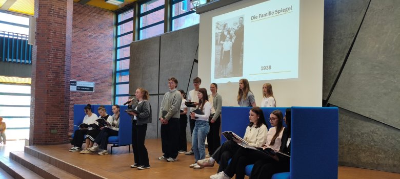 Einen besonderen Schwerpunkt setzte das von Schülerinnen und Schülern gestaltete Programm: Anhand eines in der Aula ausgestellten Zeitstrahls sowie projizierter Großfotos zeichneten sie die Lebensstationen von Paul Spiegel nach und machten historische Zusammenhänge anschaulich und lebendig.
