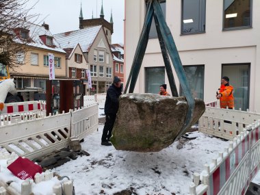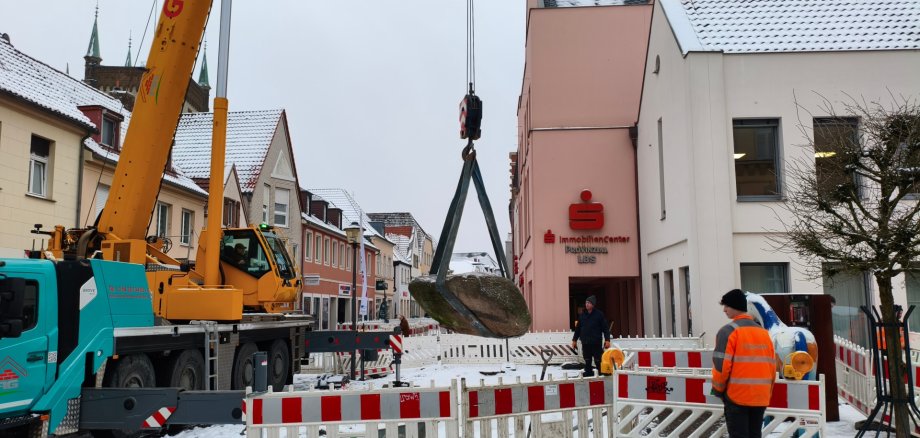 Der Quellstein des Brunnens an der Münsterstraße Höhe Sparkasse Münsterland-Ost ist am Morgen um einige Meter versetzt worden. Die Arbeiten wurden mit einem Kranwagen durchgeführt.