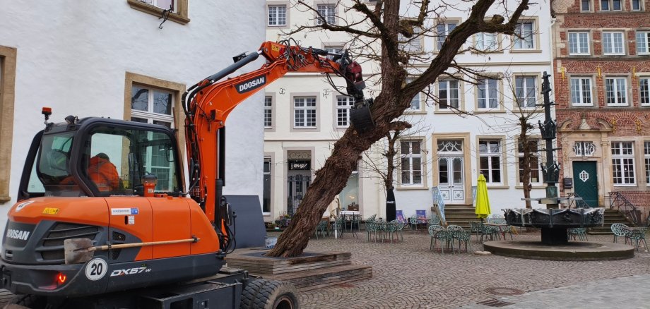 Die markante Scheinakazie (Robinie) vor dem Historischen Rathaus am Warendorfer Marktplatz ist heute Morgen planmäßig gefällt worden. Die Fällung erfolgte auf Grundlage eines Beschlusses des Umwelt- und Mobilitätsausschusses, der sich in der vergangenen Woche mehrheitlich für diese Maßnahme ausgesprochen hatte. Vorausgegangen war eine intensive öffentliche und politische Diskussion über den Zustand des Baumes.