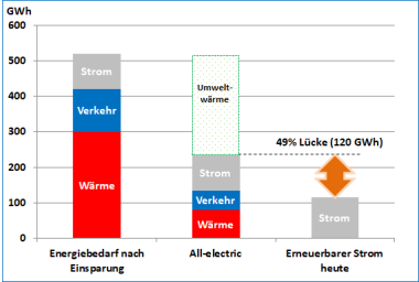 All-electric-Szenario (aus: Entwurf Klimaschutzstrategie 2023)In Summe wird der Energieverbrauch im Szenario durch Einsparung und Effizienz von heute rund 760 GWh auf rund 520 GWh im Jahr gesenkt. Die Nutzung der Umweltwärme senkt den Energiebedarf weiter ab auf 280 GWh. Durch den gleichzeitigen Ersatz der aktuell noch dominierenden fossilen Energien (Gas, Öl, Benzin und Diesel) durch regenerative Energien (Wind, Solar, Biomasse und weitere) können die CO2-Emissionen letztendlich um über 90 % abgesenkt werden. Den deutlich größten Anteil dieser Energie sollen Windkraftanlagen liefern. PV-Strom und Biomasse im Wärmebereich stellen ebenfalls größere Anteile.