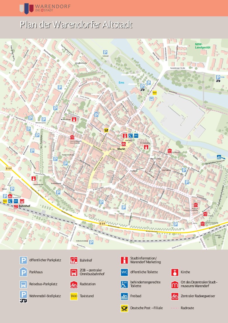 Das Zentrum Warendorfs, die historische Altstadt, ist dabei für Fußgängerinnen und Fußgänger und Radfahrerinnen und Radfahrer reserviert. Die Fußgängerzone und die verkehrsberuhigten Bereiche der Altstadt verhindern das Durchfahren mit dem Auto und sorgen für eine hohe Aufenthaltsqualität.