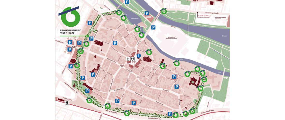 Die Promenade ist mehr als ein Spazierweg. Sie ist eine historische Entdeckungstour, die zum Rundgang durch Warendorf einlädt. Im Schatten der Bäume können Sie flanieren, verweilen oder auf einer Bank entspannen. Zahlreiche Infotafeln erzählen Wissenswertes und Anekdotisches über Gebäude, Persönlichkeiten und Ereignisse aus der Stadtgeschichte Warendorfs. So wird jeder Halt zu einem kleinen Einblick in die Vergangenheit.